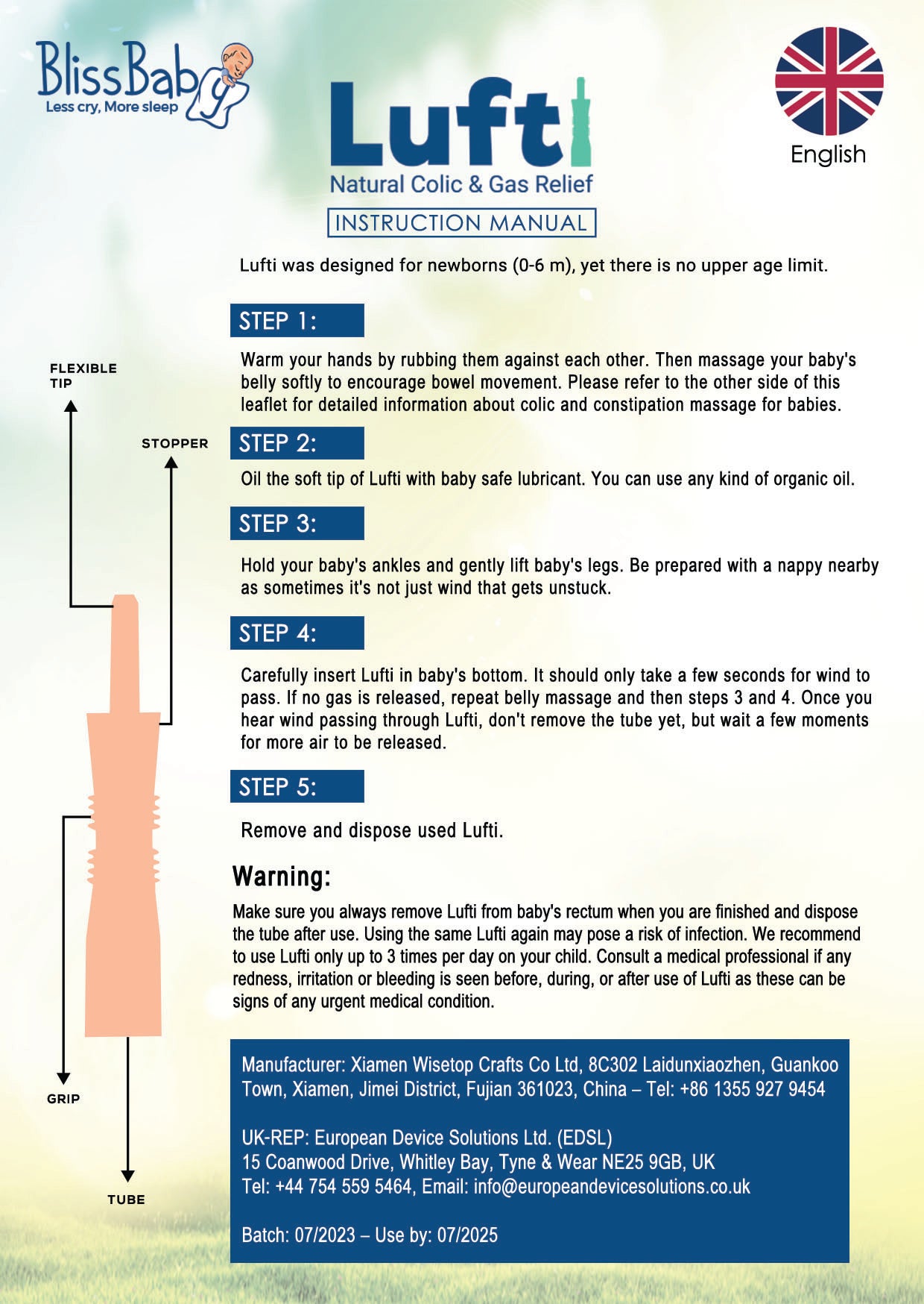 👶 PARENTS LOVE LUFTI - Over 50,000 Luftis have already been sold. Check out the reviews on amazon. With each purchase you receive 10 colic relievers, a how-to-use guide and massage tips to help relieve your baby from colic & constipation.